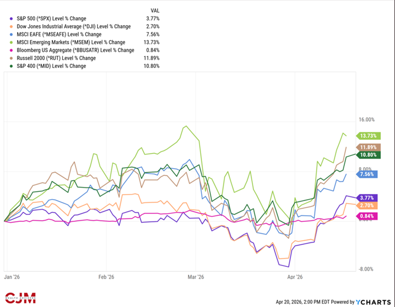 Worries over AI spending in early 2026 have put pressure on the Dow Jones and the Nasdaq, contributing to a sell-off and resulting in market participants looking for other places to invest their money. Other U.S. sectors have benefitted in the wake of this concern. Mid-sized U.S. companies have performed well this year, with the S&P 400 returning over 10% year-to-date through mid-April. Robust earnings growth and attractive valuations relative to larger U.S. technology companies are among factors that have been helpful to mid-sized U.S. companies this year have been.